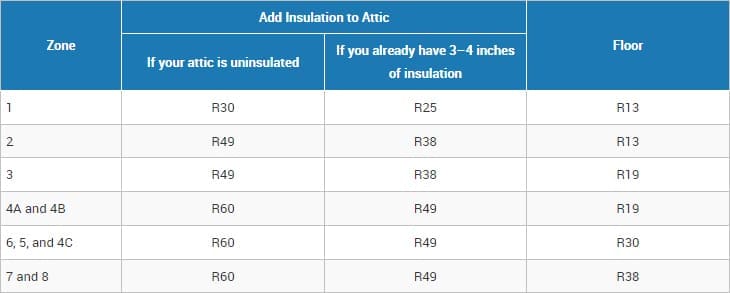 Here is the recommended Home Insulation R–Values via energystar.gov